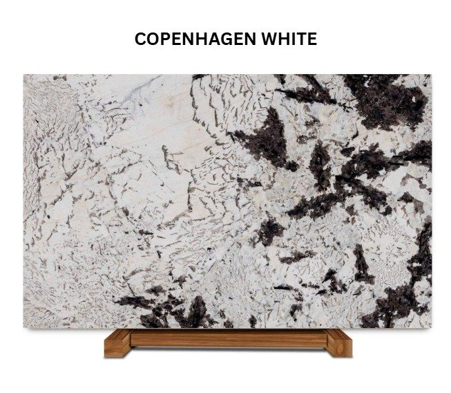 Copenhagen White granite is a stunning natural stone that captures the essence of dynamic beauty and refined luxury. With its predominantly white base, this granite is accentuated by bold, dark mineral deposits and intricate veining that create a captivating contrast and depth. Each slab is unique, boasting natural patterns that evoke a sense of movement and artistry.